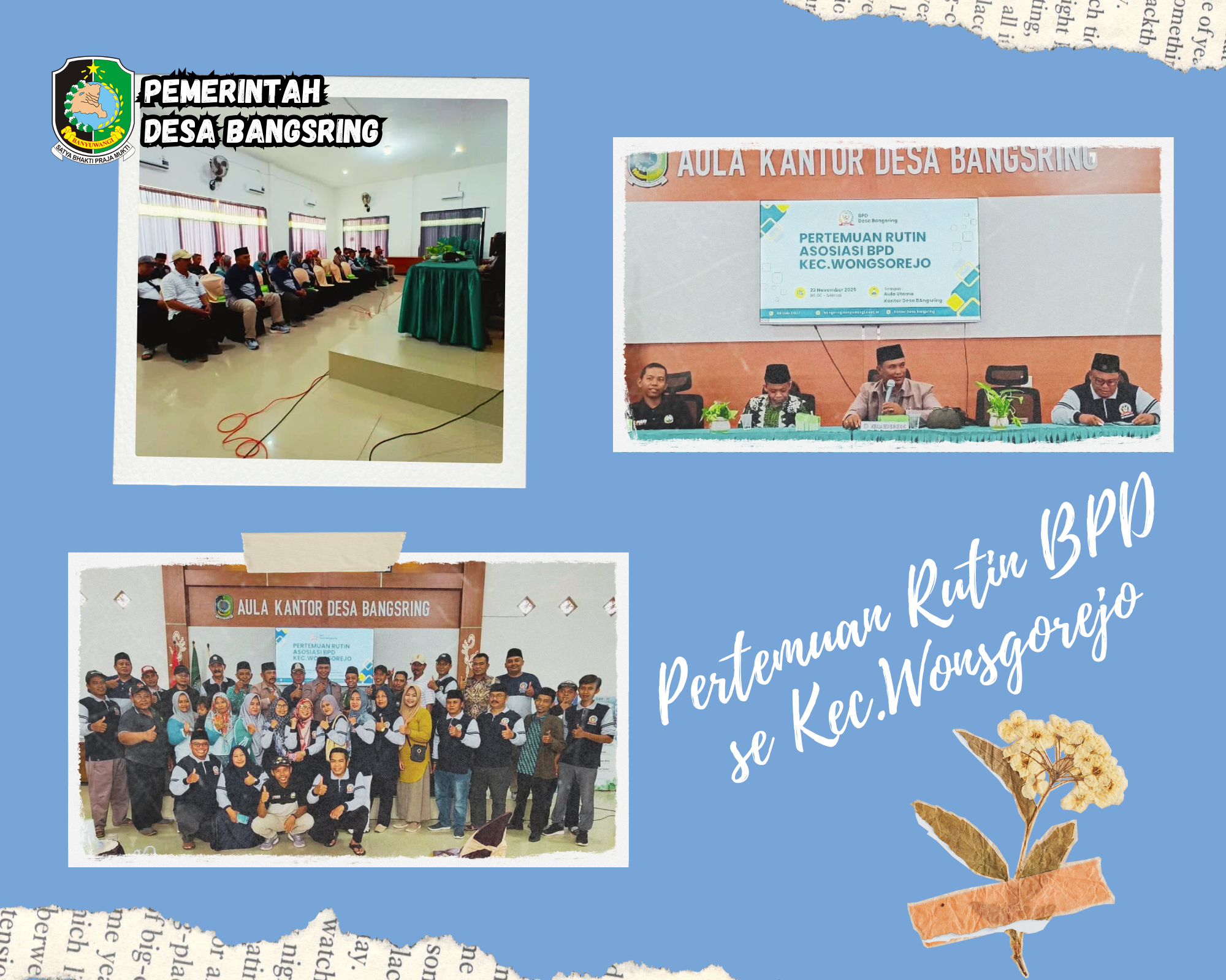 Bangsring, Kecamatan Wongsorejo — Asosiasi Badan Permusyawaratan Desa (BPD) se-Kecamatan Wongsorejo kembali melaksanakan pertemuan rutin sebagai wadah koordinasi, komunikasi, dan penguatan peran BPD dalam penyelenggaraan pemerintahan desa. Pada kesempatan kali ini, pertemuan dilaksanakan di Aula Kantor Desa Bangsring pada Tanggal, 23 November 2025.