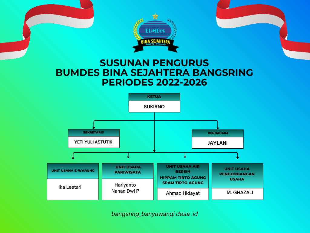 PENGURUS BUMDES BINA SEJAHTERA Ketua BUMDES : Sukirno No.WA : 08155941059 Sekretaris : Yeti Yuli Astutik NO.WA : 08113783272
